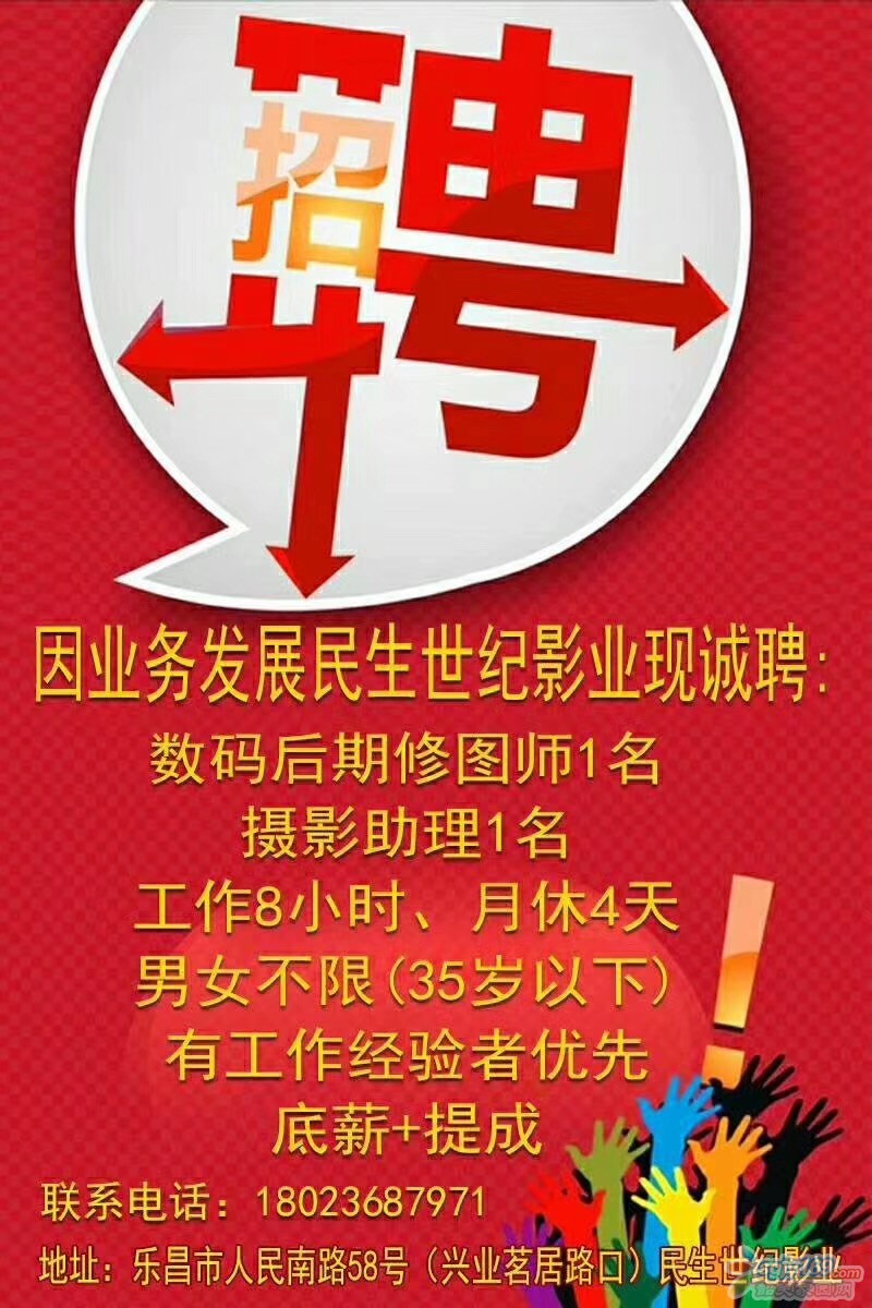正文摘要:因業(yè)務(wù)發(fā)展民生世紀影業(yè)現(xiàn)誠聘: 數(shù)碼后期修圖師1名、攝影助理1名 工作8小時、月休4天 男女不限(35歲以下) 有工作經(jīng)驗者優(yōu)先 底薪+提成 地址:樂昌市人民南路58號(興業(yè)茗 ... |